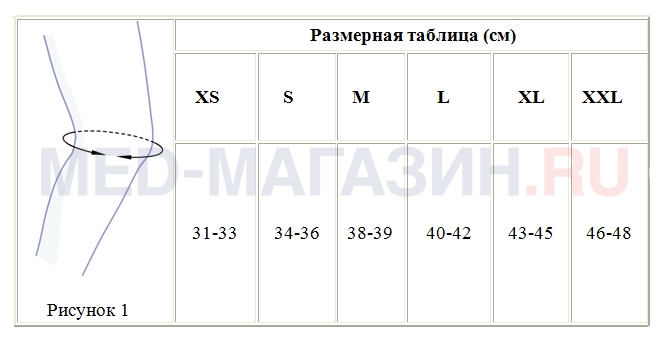 Для правильного определения размера измерьте сантиметровой лентой окружность колена, как это показано на рисунке 1. Затем воспользуйтесь размерной таблицей.