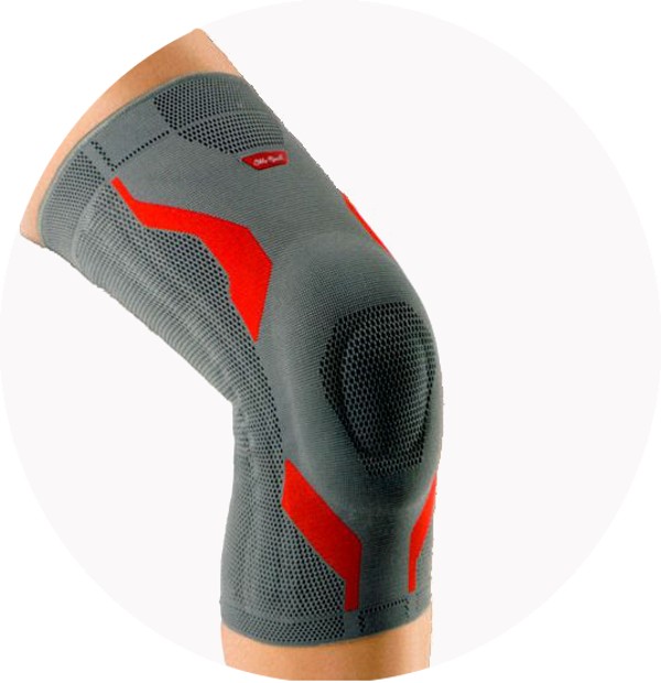 Коленный бандаж из трикотажного полотна плоской вязки с боковыми пружинными вставками и внутренним силиконовым пелотом, охватывающим надколенник.