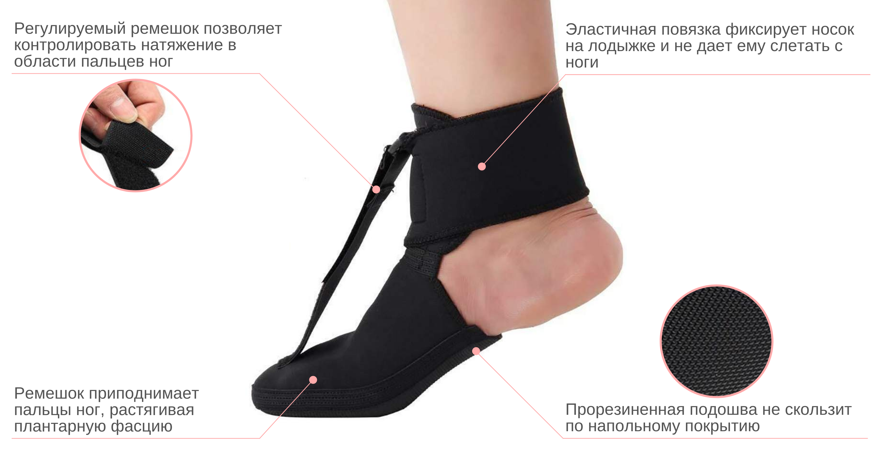 Принцип работы ортопедического изделия предельно прост: при его надевании плантарная фасция растягивается и фиксируется в этом растянутом состоянии. Это позволяет ускорить заживление микротравм, а также препятствует отложению солей. Изделие не дает сухожилиям и мышцам расслабляться во время сна, поэтому утром человек не ощущает боли.