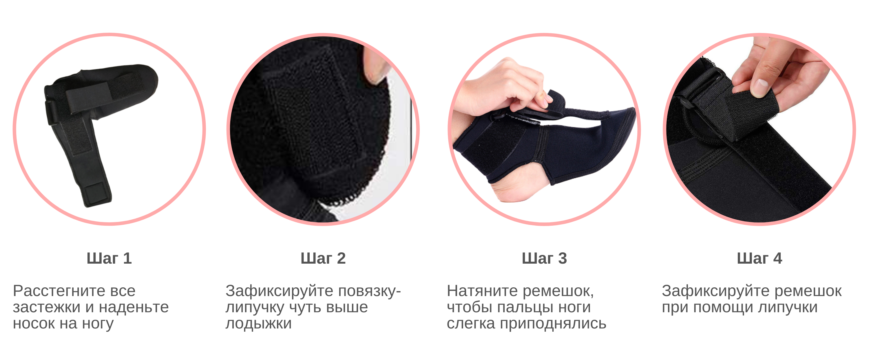- Надеть на ногу и зафиксировать при помощи липучки чуть выше лодыжки. Следите, чтобы пятка располагалась на месте;