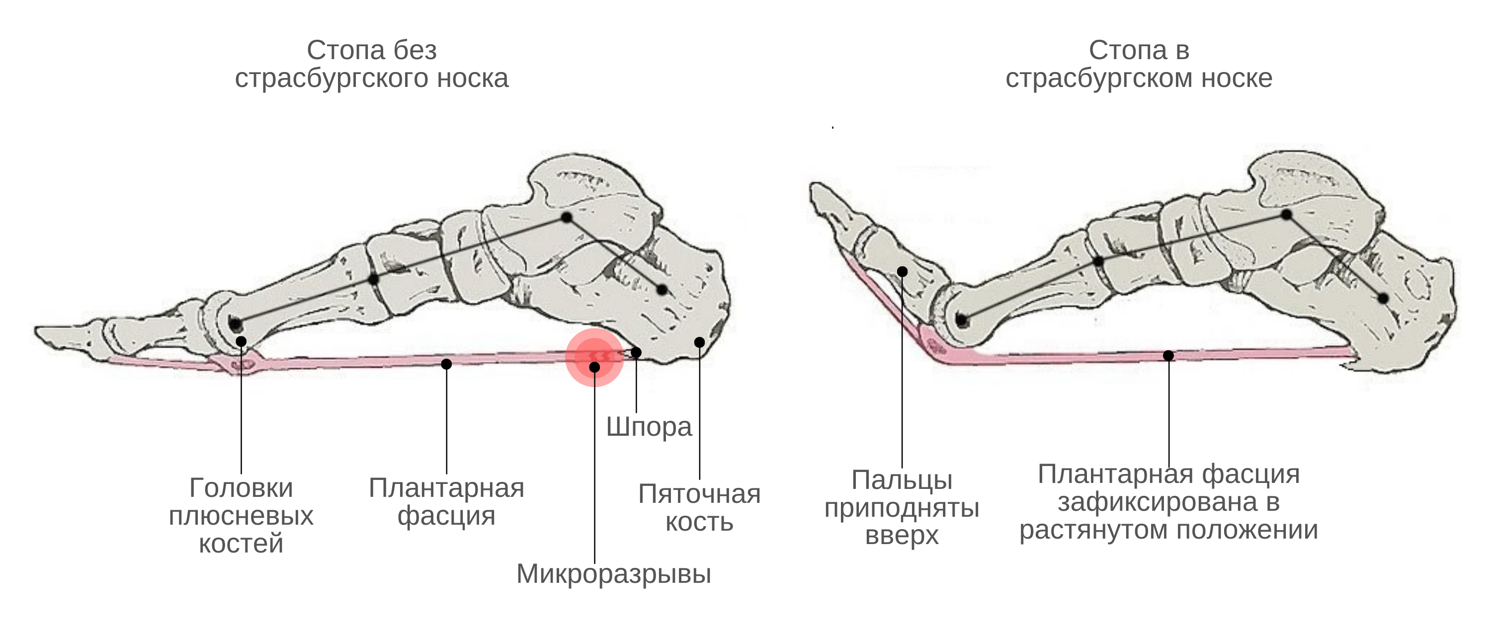 Применение страсбургского носка обеспечивает плантарной фасции такое же натянутое положение на протяжении ночи. Он фиксирует пятку и носок, сохраняя изгиб стопы в необходимом направлении. Это предотвращает микроразрывы коллагеновых волокон плантарной фасции утром.