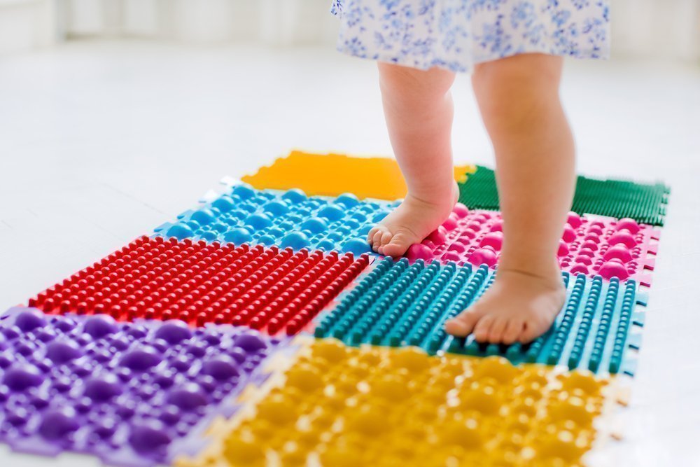 Массажный коврик или дорожку можно сделать самостоятельно. Для коврика понадобится кусок мешковины или ковролина. На него нужно пришить большие пуговицы, губки для мытья посуды, разрозненные детали от детской пирамидки из дерева, помпончики из ниток или ткани, карандаши и пластиковые крышки от молочных бутылок.