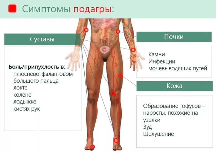 Но это лишь видимые признаки. Зачастую на фоне подагры развивается несколько сопутствующих заболеваний: