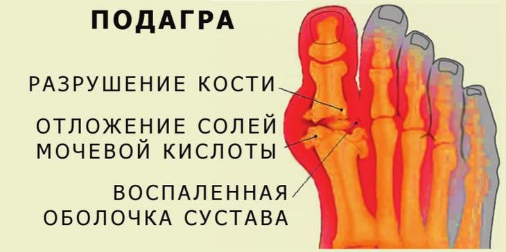 Пурины, поступающие с пищей, в процессе распада образуют мочевую кислоту. Мочевая кислота отфильтровывается из крови почками и выводится вместе с мочой. Развитие подагры начинается тогда, когда почки не справляются со своей выделительной функцией и мочевая кислота продолжает циркулировать в крови в большом количестве. Через некоторое время она преобразуется в ураты – колючие кристаллы мочевой соли, которые оседают не только на внешних и внутренних поверхностях суставов, но также и в других органах. Ураты химически взаимодействуют с окружающими жидкостями и выделяют химические вещества, которые вызывают раздражение и воспаление тканей. Иммунитет даёт специфический ответ: огромное количество лейкоцитов направляется в место очага развития воспаления и начинает уничтожать не ураты, а ткани организма. При этом человек испытывает сильнейшие боли. При отсутствии адекватного лечения, подагра разрушает другие органы, так как мочевая кислота продолжает распадаться на ураты, которые свободно плавают по кровяному руслу организма. Они могут оседать в почках, образуя остроугольные камни и вызывая развития мочекаменной болезни. И всё же, в самую первую очередь страдают именно суставы.