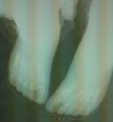 Рентгенологическим методам исследования врожденной косолапости посвящено немного работ. Так, (1965) производила рентгенограммы в плантарной, латеральной и косой проекциях. При односторонней косолапости для сравнения исследовали вторую стопу. отметила у детей с врожденной косолапостью значительные нарушения соотношения костей стопы без изменения их формы.