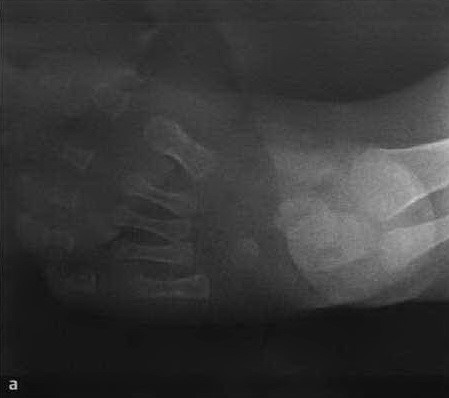 а, b Косолапость в возрасте 5 мес.: а) Рентгенограмма стопы в дорсальной проекции демонстрирует укорочение ахиллова сухожилия, отсутствие наклона пяточной кости от задненижнего до верхнепереднего положения и горизонтальное поражение таранной кости, вызывающее уменьшение таранно-пяточного угла;