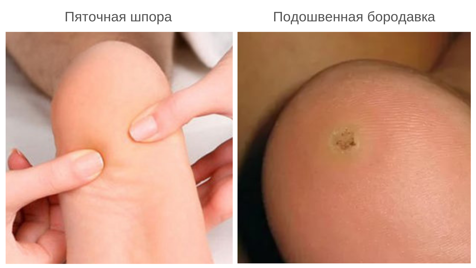 Часто за плантарный фасциит принимают подошвенную бородавку на пятке. На самом деле, пяточная шпора и бородавка не имеют ничего общего, т.к. костно-солевой шип находится глубоко в мягких тканях и никак не проявляется на подошве.