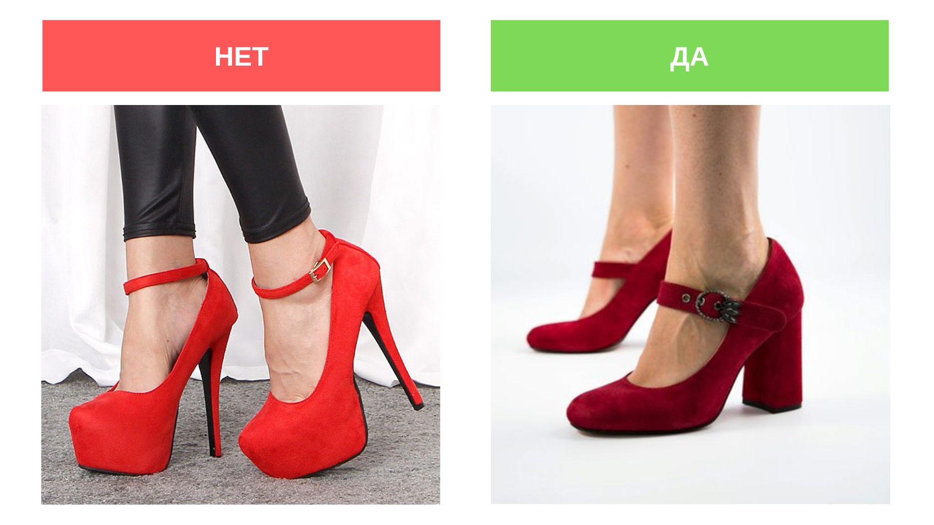 Выбирайте туфли на устойчивом каблуке средней высоты - три-пять сантиметров.
