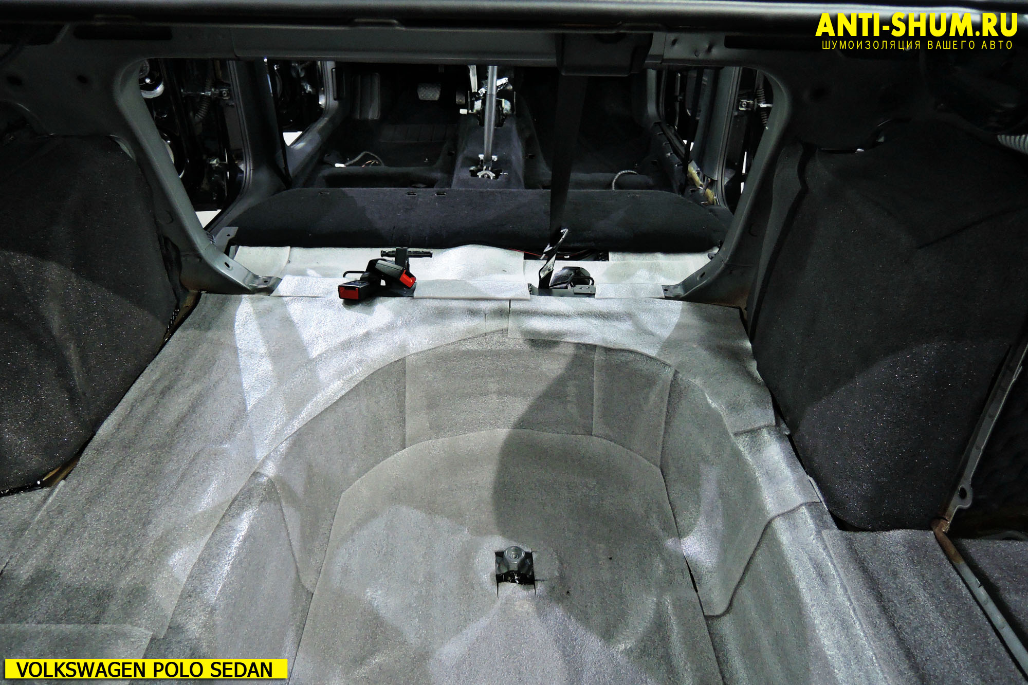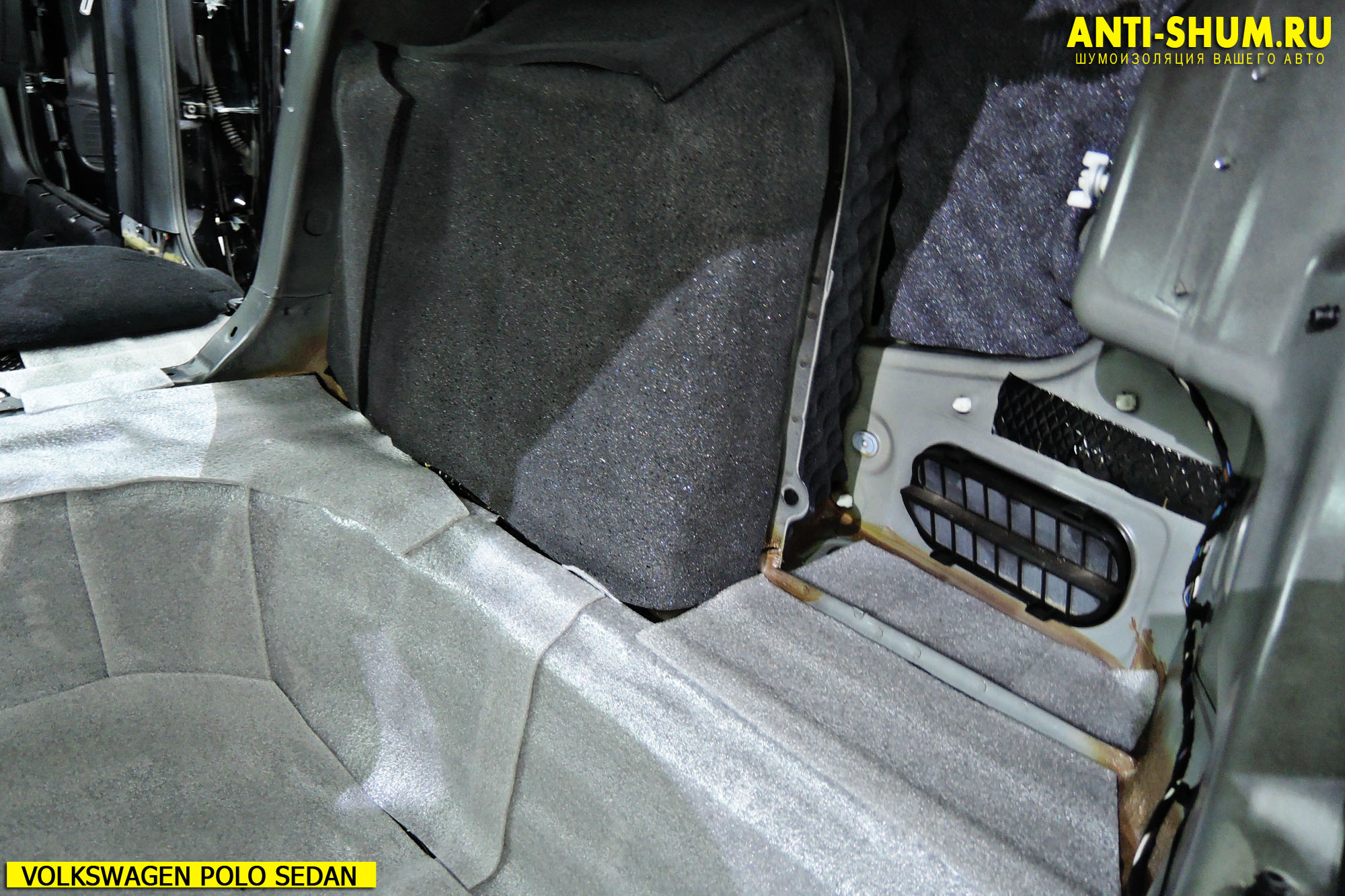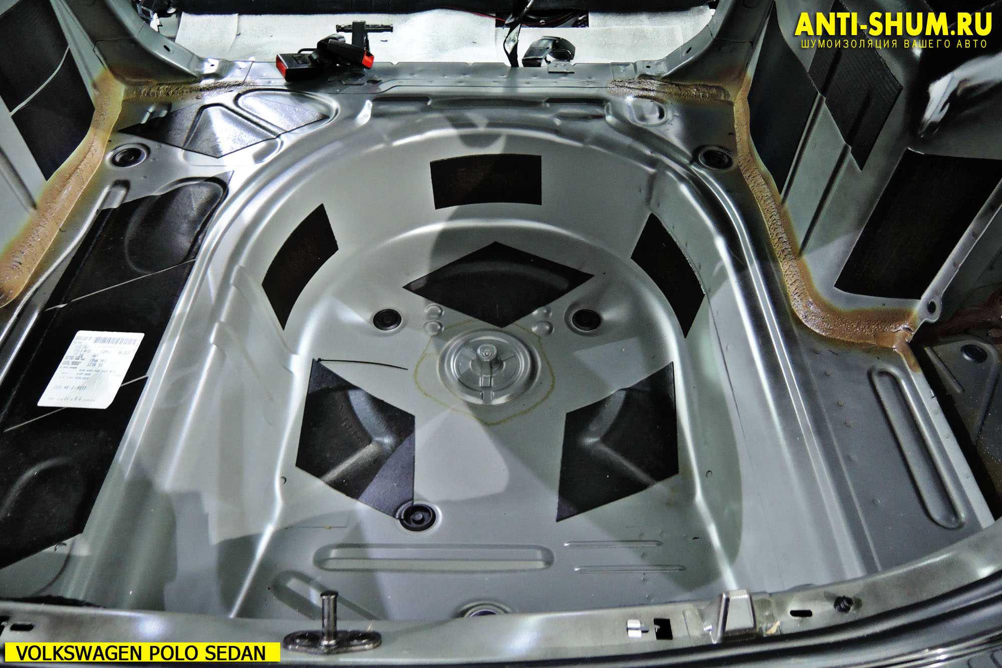 Общий вид багажника Volkswagen Polo Sedan после шумоизоляции в два слоя.