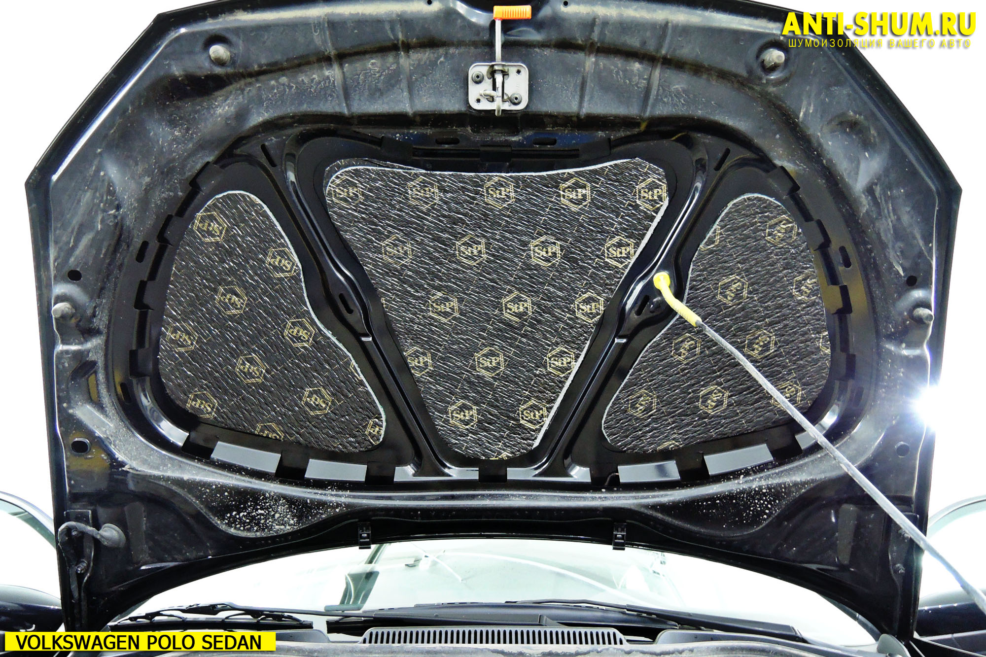 Шумоизоляция капота позволяет существенно снизить высокочастотную составляющую шума двигателя, ведь немалая часть этого шума попадает в салон автомобиля именно через тонкий металл капота и лобовое стекло. Причем чем большую площадь внешнего металла капота нам удается проклеить, тем больший эффект по снижению шума двигателя достигается в результате. На Фольксваген Поло седан площадь проклейки капота одна из самых больших среди всех автомобилей, а значит и эффект будет соответствующим!