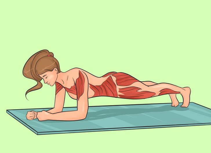 - Держите прямую линию от пяток до макушки головы, голову слегка приподнимите.