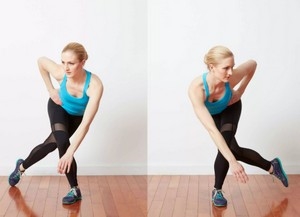 Это динамичное упражнение. Встать прямо, ноги чуть раздвинуть. Правую ступню отставить по диагонали назад. Согнуть колени в коленях, наклонить туловище вперед на 30 градусов и покачаться вверх-вниз 15 раз.