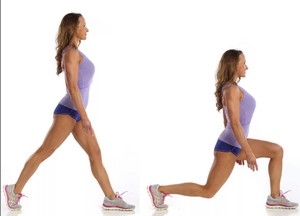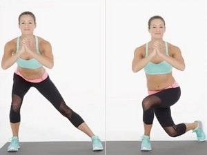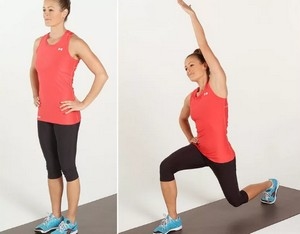 - Далее делаем выпады вперед. Встаем на правое колено, левую ногу выставляем вперед и сгибаем в колене, прогибаемся вниз на 3 секунды, повторяем 10 раз. затем меняем ногу и повторяем процедуру.