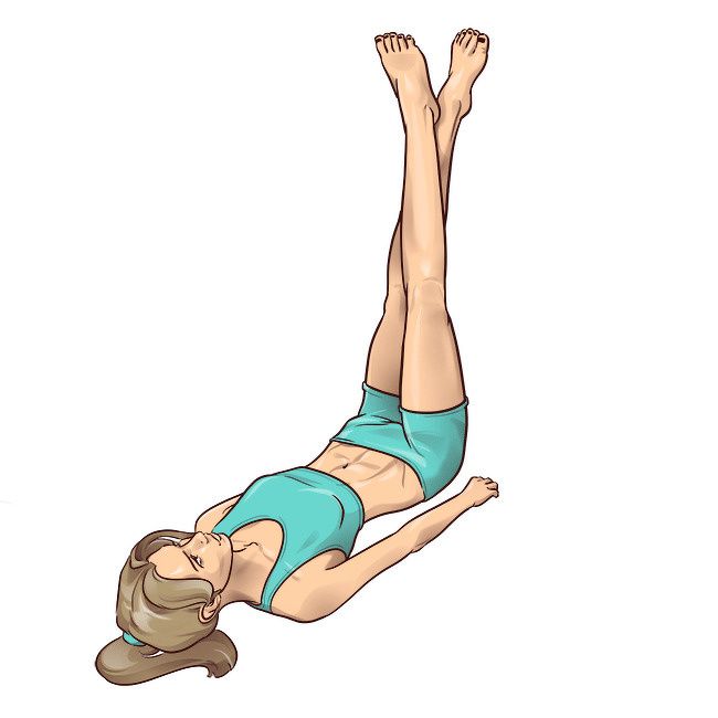 2. Ножницы. Снова лежа на спине, ноги поднимаются перпендикулярно полу и слегка сгибаются в коленях. Напрягая бедра, повторять такое же количество движений, как и в первом сете, имитируя ножницы. При этом ноги располагаются поочередно: правая над левой, затем наоборот. Не забывайте выдерживать темп и делать небольшой перерыв.