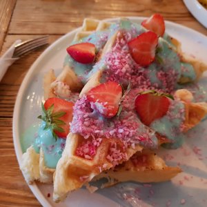 Самые вкусные вафли в Москве! Порции большие! Единственное, места очень мало, сидеть не всегда удобно, коленями об столик бьешься, все чуть ли не через тебя перелазят.