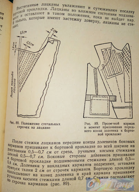 Делается вся операция по закреплению бортовой прокладки в пальто ручным способом буквально в течении получаса, если не стегать лацкан,и чаще его стегать и не нужно.