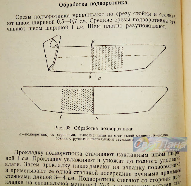 Прокладку нижнего воротника чаще всего выкраивают по косой из двух частей, которые стачивают накладным швом между собой. Затем увлажняют и утюжат до полного удаления влаги. затем прокладку накладывают на изнанку подворотника и приметывают ее посередине, затем выстегивают и т.д.