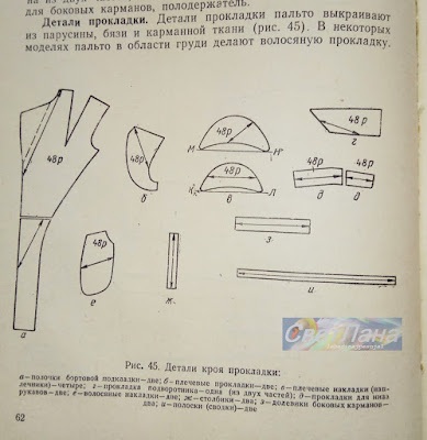 К сожалению, показать на практике в данный момент не могу, и нам придется разбираться чисто теоретически с картинками из учебных пособий по пошиву верхней одежды. Так же хочу сообщить,что рассматривать буду только основные прокладочные детали в пальто,т.е. не все.