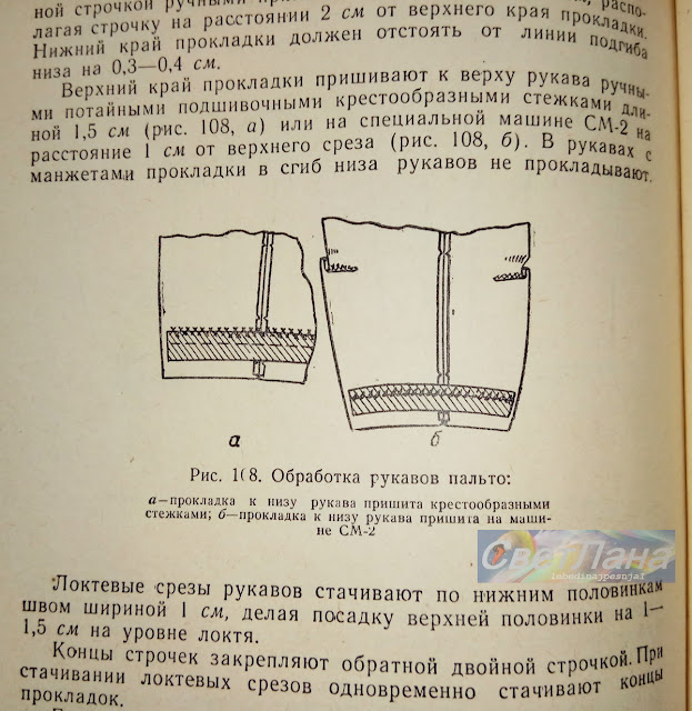 Прокладку для низа рукавов, если она состоит из двух частей, стачивают накладным швом и приметывают к рукаву одной строчкой ручными прямыми стежками длинной 3 см, располагая строчку на расстоянии 2 см от верхнего края прокладки. Нижний край прокладки должен отстоять от линии подгиба низа на 0.3- 0,4 см.