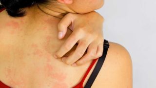 Основным симптомом являются изменения на коже: пятна на спине красные разрастаются и чешутся, шелушатся, потом появляется корка, трещины, серозная жидкость. При сильном расчесывании открываются раны, есть риск инфицирования. Локализуются симптомы не только на спине, но и по всему телу.