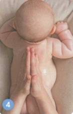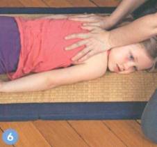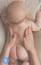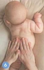 Положите теплые руки на спинку ребенка и следите за его реакцией. Затем нанесите на руки масло и положите их боком в верхней части спины, на уровне лопаток (фото 4). Разведите их в стороны, как будто открываете книгу. Следуйте линии ребер и, обнимая грудную клетку справа и слева всей поверхностью ладоней (фото 5), спускайтесь до бедер, легко поднимайтесь кончиками пальцев по обе стороны позвоночника в исходную позицию (фото 6) и повторите движение еще 1-2 раза.