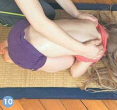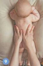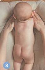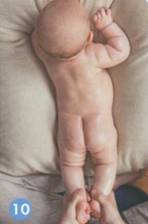 Чтобы сделать этот массаж спины и ножек малыша снова сложите руки в верхней части спинки. Затем разведите в стороны и, обнимая грудную клетку, скользите вниз (фото 9), не останавливаясь на бедрах, а продолжайте движение до пяток, потом до кончиков пальцев и дальше, как будто вытягиваете невидимые нитки (фото 10). Повторите 1 - 2 раза.