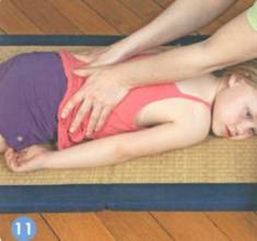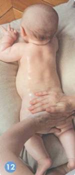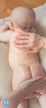 Чтобы делать массаж спины разместитесь сзади ребенка, разогрейте руки. Мягко положите ладони на нижнюю часть спины (фото 8), оставайтесь так некоторое время, затем осторожно, но твердо ведите руки кверху, по обеим сторонам позвоночника (фото 9). На сам позвоночник не опирайтесь, только по бокам от него. Дойдя до плеч (фото 10), спуститесь по бокам легким поглаживанием. Теперь смените позицию и сделайте то же движение в обратном направлении - сверху вниз (фото 11) - и поднимитесь по бокам.