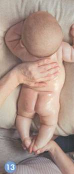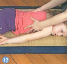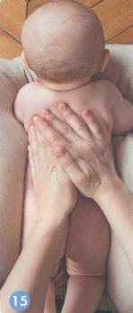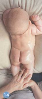 Сядьте сбоку от ребенка. Положите руки на верхнюю часть спины по обеим сторонам позвоночника. Встречным движением рук (правая вперед, левая назад (фото 13) и наоборот (фото 14) скользите медленно вниз по спине. Затем так же поднимитесь. Повторите 2-3 раза туда-обратно.