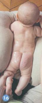 Расположите руки крест-накрест в верхней части спинки (фото 17). Делая массаж спины скользите по бокам ребенка, пока не коснетесь подстилки, затем смените положение (фото 18).