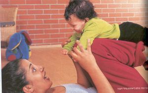 - Лечь самой на пол, согнув ноги в коленках, положить ребёнка на сомкнутые колени, вытянуть его ручки вперёд и покачать.