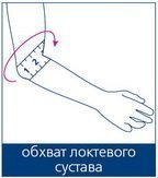 Возьмите сантиметровую ленту. Плотно, но не затягивая, измеряйте обхват локтевого сустава в соответствии с картинкой.