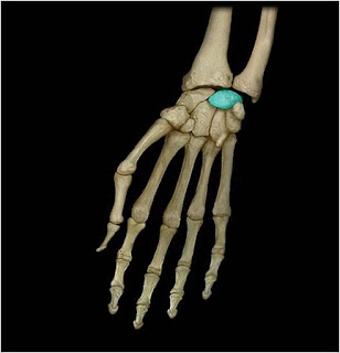 Кости запястья расположены в два ряда. Проксимальный ряд костей: ладьевидная (os scaphoideum), полулунная (os lunatum), трёхгранная (os triquetrum), гороховидная кость (os pisiforme).