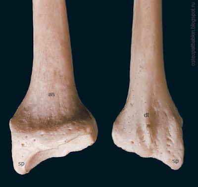 Рис. На левом рисунке нижняя часть лучевой кости спереди, на правом рисунке сзади: sp—шиловидный отросток, as—передняя поверхность лучевой кости, dt—дорсальный бугорок, или бугорок Листера.