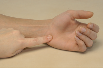 Рис. Пальпация бугорка кости трапеции, или tuberculum ossis trapezii.