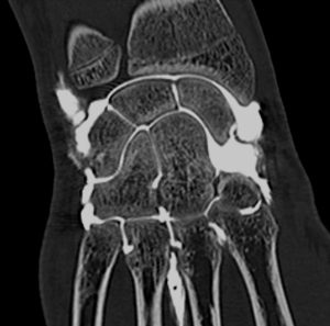 Из всех диагностических мероприятий, которые используются в современной ортопедии и травматологии для выявления патологии костных структур верхней конечности, самым информативным является компьютерная томография кисти. Метод основан на сканировании руки при помощи рентгеновского излучения. Результатом исследования является ряд послойных снимков, позволяющих выявить структурные дефекты суставов кисти, костных структур и мягкотканных образований запястья.