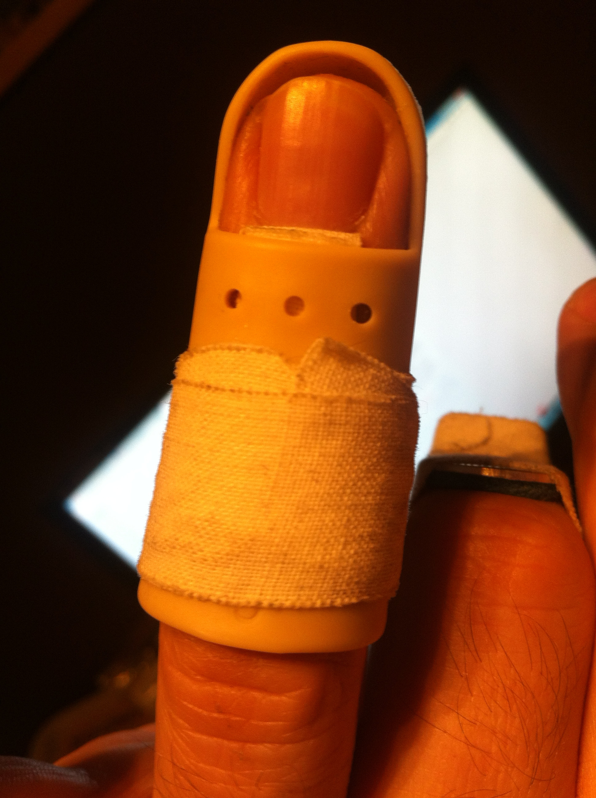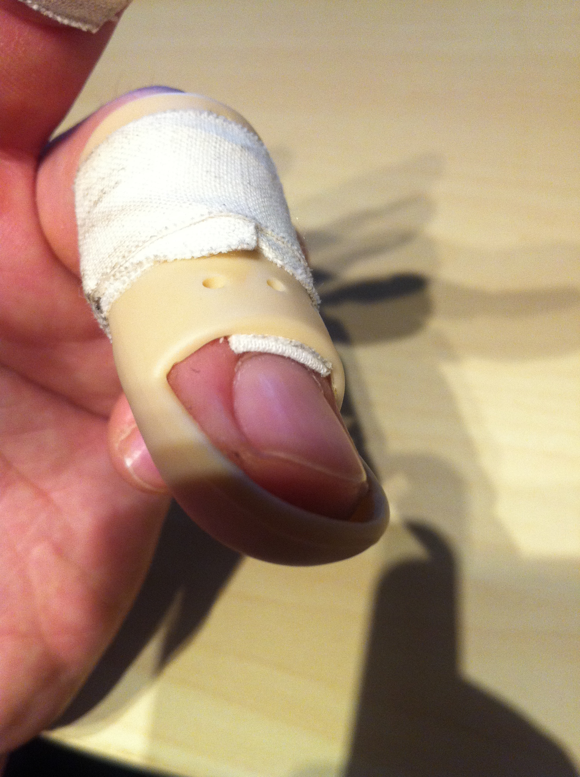 У меня разрыв разгибателя ногтевой фаланги среднего пальца правой руки. В т/п мне поставили гипсовую лангету на весь палец с максимальным разгибанием ногтевого сустава, что очень не удобно, т.к. палец прямой и задевает за все, да и гипс периодически намокает.