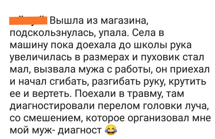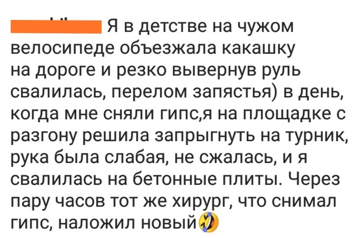 Что ж, пару километров предстояло пройти пешком, очень медленным шагом, ведя за руль велосипеды. По пути, как назло, встретили "горячих" подружек моего старшего лет на 5 двоюродного брата, которые озадачились, почему мы идём пешком и почему я рыдаю. Вернувшись в дачный дом, бабушка и её соседские бабули-подруженции сказали, что это всё фигня, кость не торчит, значит нет ничего. Заснул на печке, да и вроде нормально уже всё, ночью даже поспать удалось, в любимой мной манере - переворачиваясь с бока на бок в процессе засыпания, аки ротор трёхфазного электродвигателя.