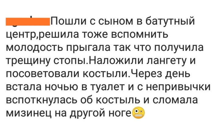 Ну, и раз уж не получилось в двух словах, стоит упомянуть и про технологию удаления металлической спицы - добрый доктор сказал сесть на стул, я приготовился к тому, что сейчас он мне расскажет про вторую операцию, что нужно будет готовиться к ней несколько дней, а он взял плоскогубцы и одним движением вытащил её. Ни наркоза, ни спец.средств кроме плоскогубцев, просто, как гвоздь из доски. Зато я после этого почему-то придумал и постоянно напевал песенку "Добрый доктор Сулико вытащил мне спицу!", до сих пор фамилию хирурга помню!