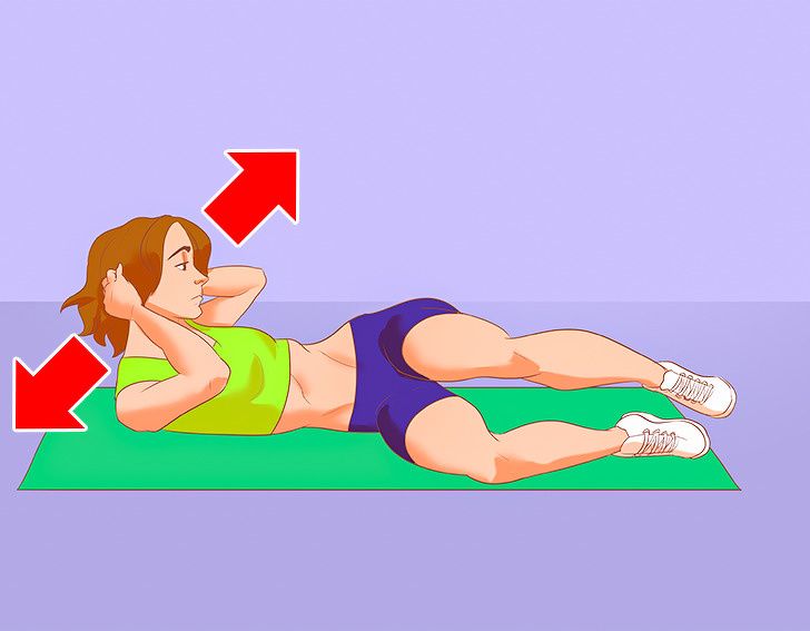 - Одновременно сгибайте правое колено к груди и тянитесь к нему левым локтем, напрягая косые мышцы живота.