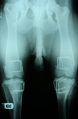 В течение 15 лет клиника занимается лечением вальгусной деформации грудной конечности у собак. На сегодняшний день выработана единая стратегия лечения данной патологии. У животных в период интенсивного роста с 4,5 до 9 месяцев выполняется блокирование дистальной зоны роста лучевой кости металлическими скобами с одномоментной сегментарной остеотомией диафиза локтевой кости (Рис.1). Что позволяет у 70-80% животных нивелировать деформацию конечности и избежать более сложной операции.