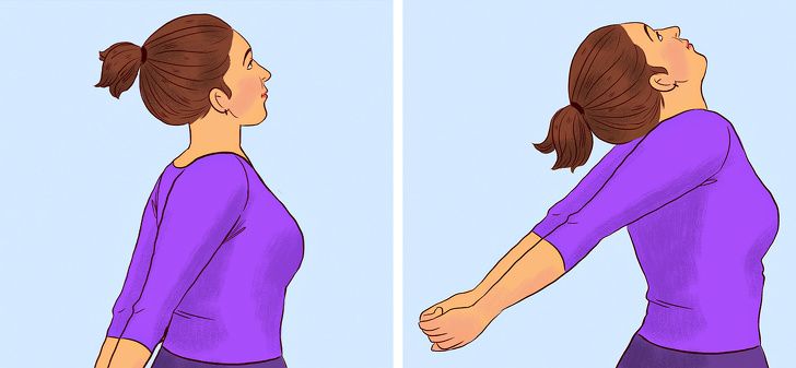 Соедините вытянутые руки за спиной и запрокиньте голову назад. Теперь сведите лопатки и отведите руки так далеко, как только сможете. Сделайте вдох, а когда будете возвращаться в исходное положение — выдох.
