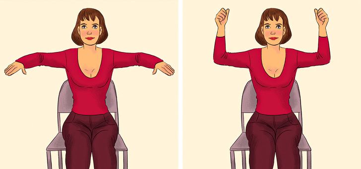 Все так же ровно сидя на стуле, выпрямите руки перед собой. Теперь разведите их в стороны, одновременно сгибая в локтях под прямым углом. Ненадолго задержитесь в этом положении. Обязательно следите за тем, чтобы все время удерживать руки параллельно полу. Теперь поднимите большие пальцы вверх и постарайтесь, медленно поднимая руки, указать назад. Задержитесь в этом положении ненадолго.