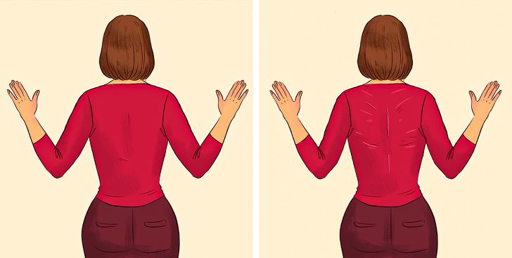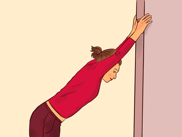 Встаньте лицом к стене и обопритесь на нее руками. Наклонитесь вперед и задержитесь в этом положении на 15–20 секунд. Важно, чтобы ваша спина все время оставалась прямой, а голова находилась с ней на одной линии. После постарайтесь прогнуть спину. Так нужно простоять еще 15–20 секунд.