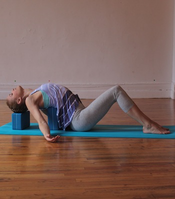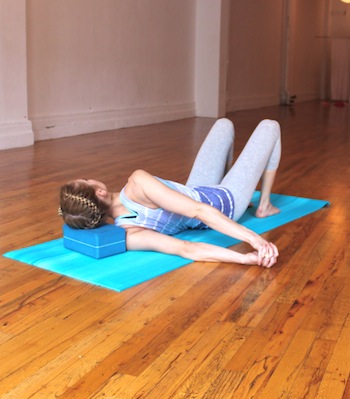 Поставь один блок там, где будут находиться лопатки, а другой — под голову. Расслаблено ляг на блоки, устройся поудобней, руки размести с обеих сторон. Сделай пять глубоких вдохов.