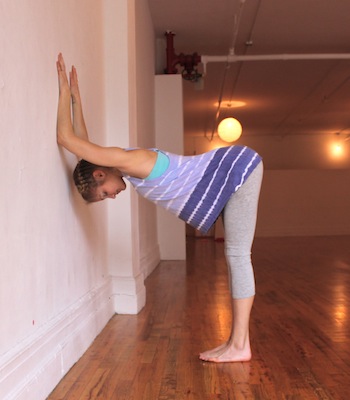 Размести предплечья на стене, параллельно друг другу ниже высоты плеч. Отойди от стены на пару шагов, расслаблено опусти голову между руками. Сделай пять глубоких вдохов.