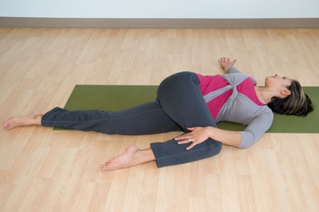 - Не отрывая плечи от пола, поверните оба колена сначала в правую сторону, затем в левую сторону, дышите глубоко и свободно.