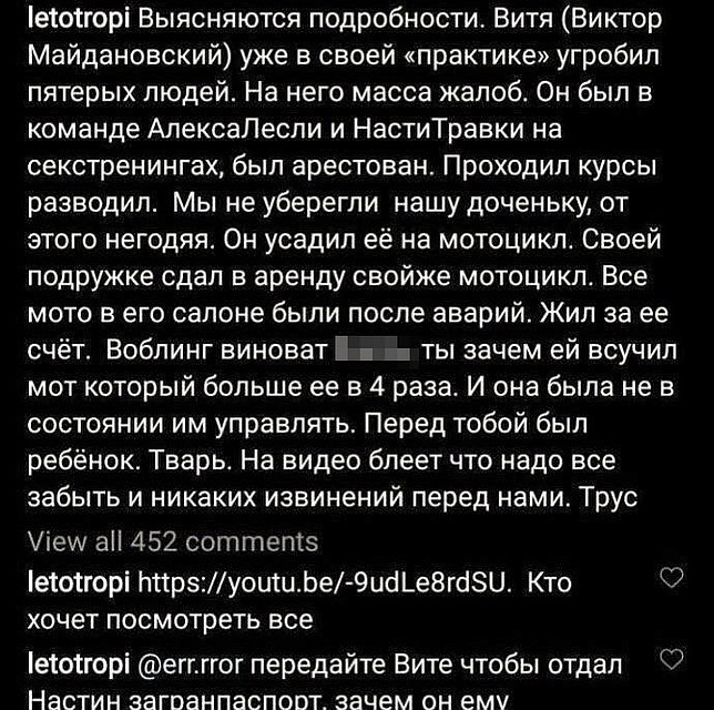 "Выясняются подробности. Виктор Майданович уже в своей практике угробил пятерых людей. На него масса жалоб. Он был в команде Алекса Лесли и Насти Травки на секс-тренингах. Был арестован. Проходил курсы разводил", - написал отец Насти Тропицель в блоге.