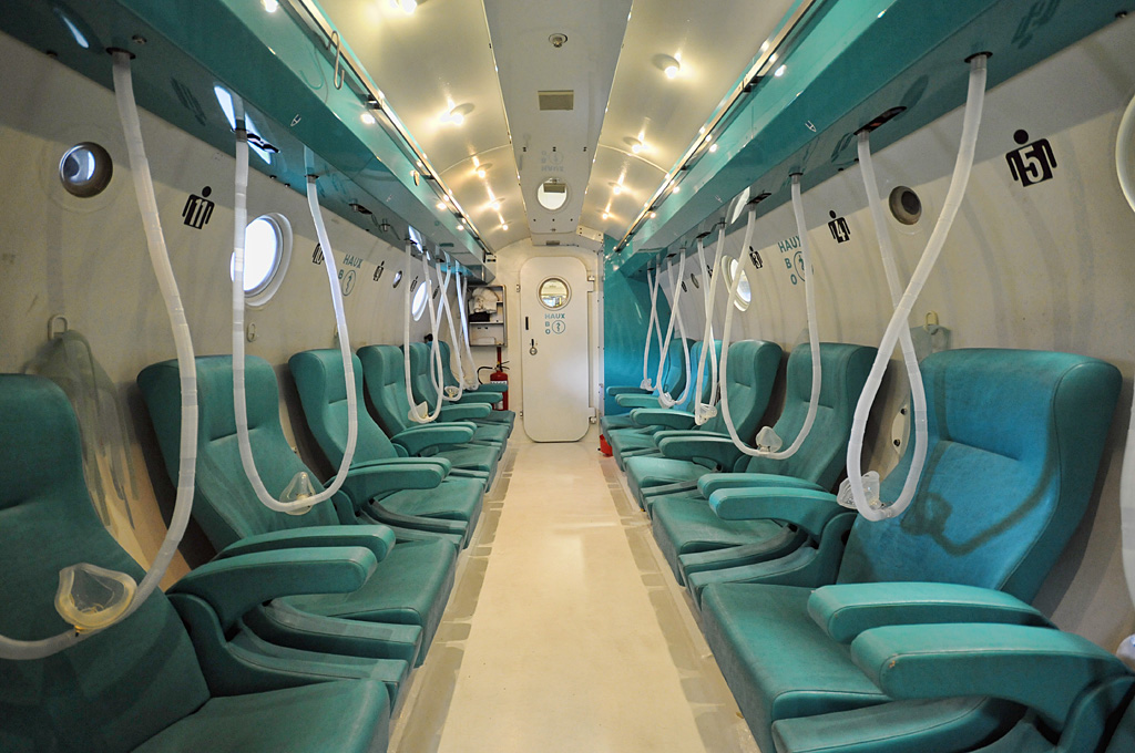 Давление внутри барокамеры выставляется согласно курсу лечения — от 1.1 АТА до 2-3 АТА. Это примерно до 30 метров под водой.
