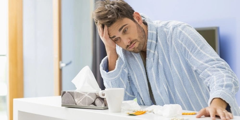 При гриппе или ОРВИ болит голова спереди. Болезненные проявления умеренные и усиливаются при попытке встать с кровати или при наклоне головы.