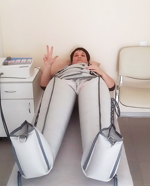 Прессотреапия - это ужасно смешно. Надеваются надувные штаны..сапоги. короче, надувные мешки в форме сапог до паха. И талия оборачивается какой-то надувной фигней. Главврач затянул на мне эту штуку, а она даже в самом затянутом виде болтается. Бормотнул: "Да, это, конечно, не на вашу талию рассчитано". Просто прессотерапия используется прежде всего для похудения))) Потом 20 минут эти мешки надувались, начиная снизу, постепенно доползая до верха. Ноги забавно сдавливало, а мешок на талии только без толку шуршал)) Говорят,от этой процедуры лимфодренаж улучшается)) Ножки действительно были потом легкие-легкие.